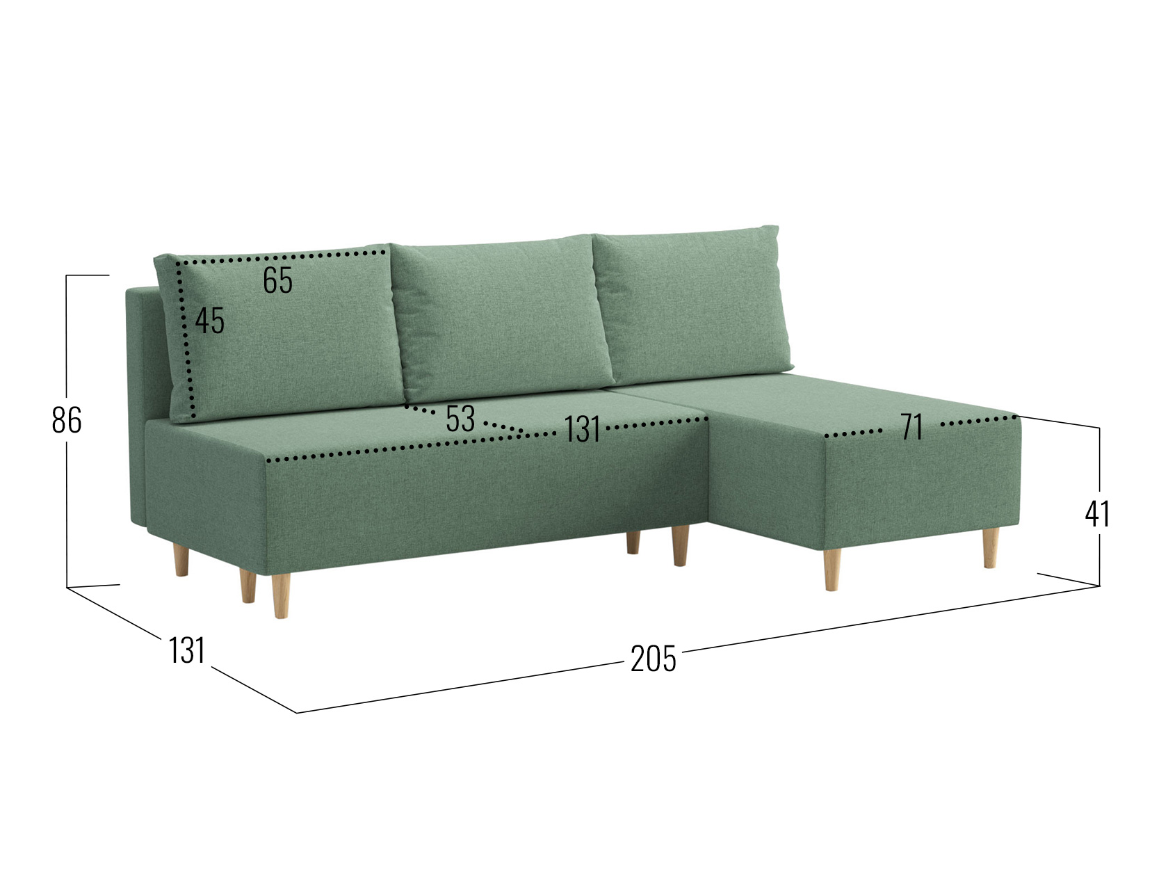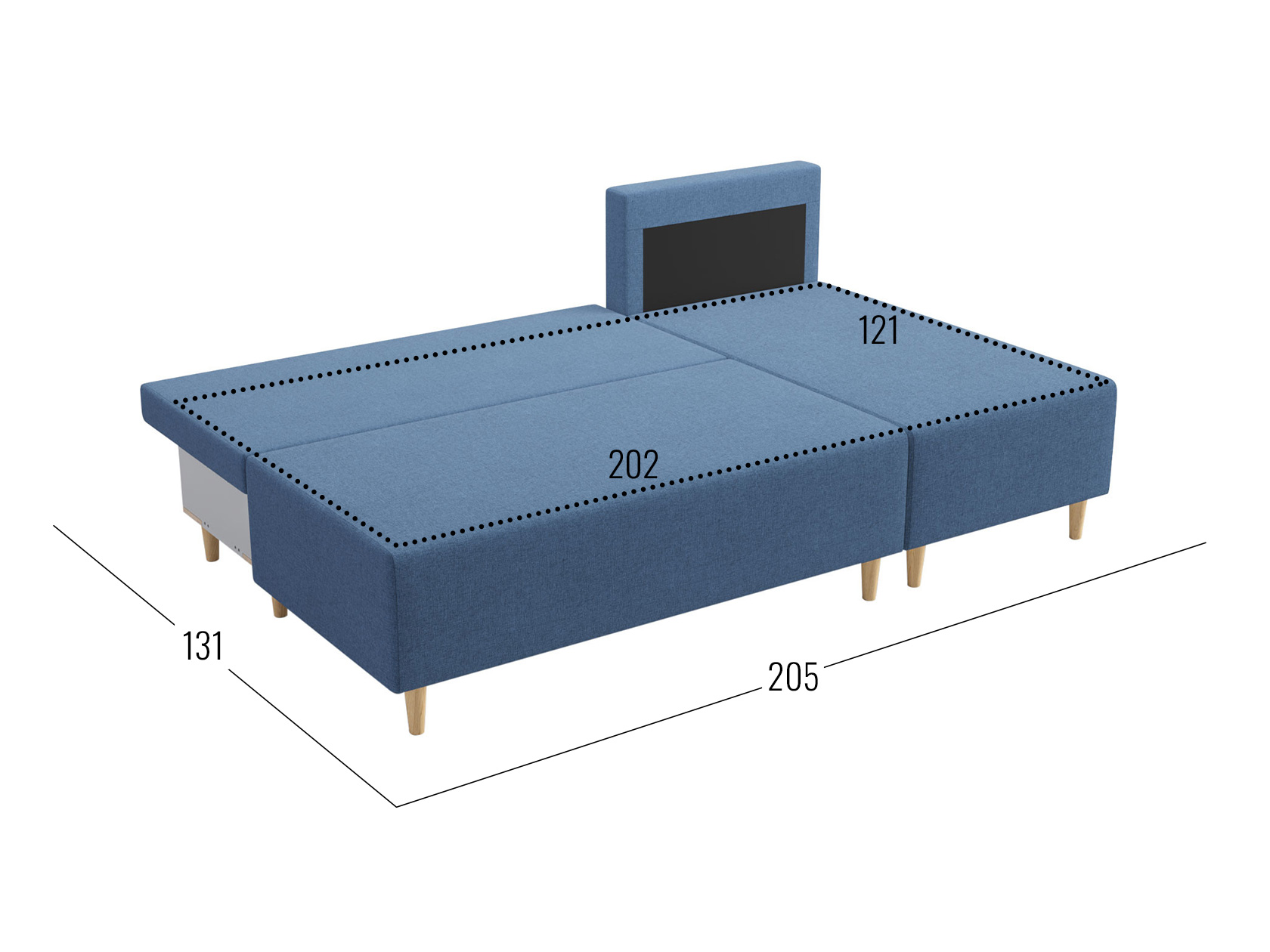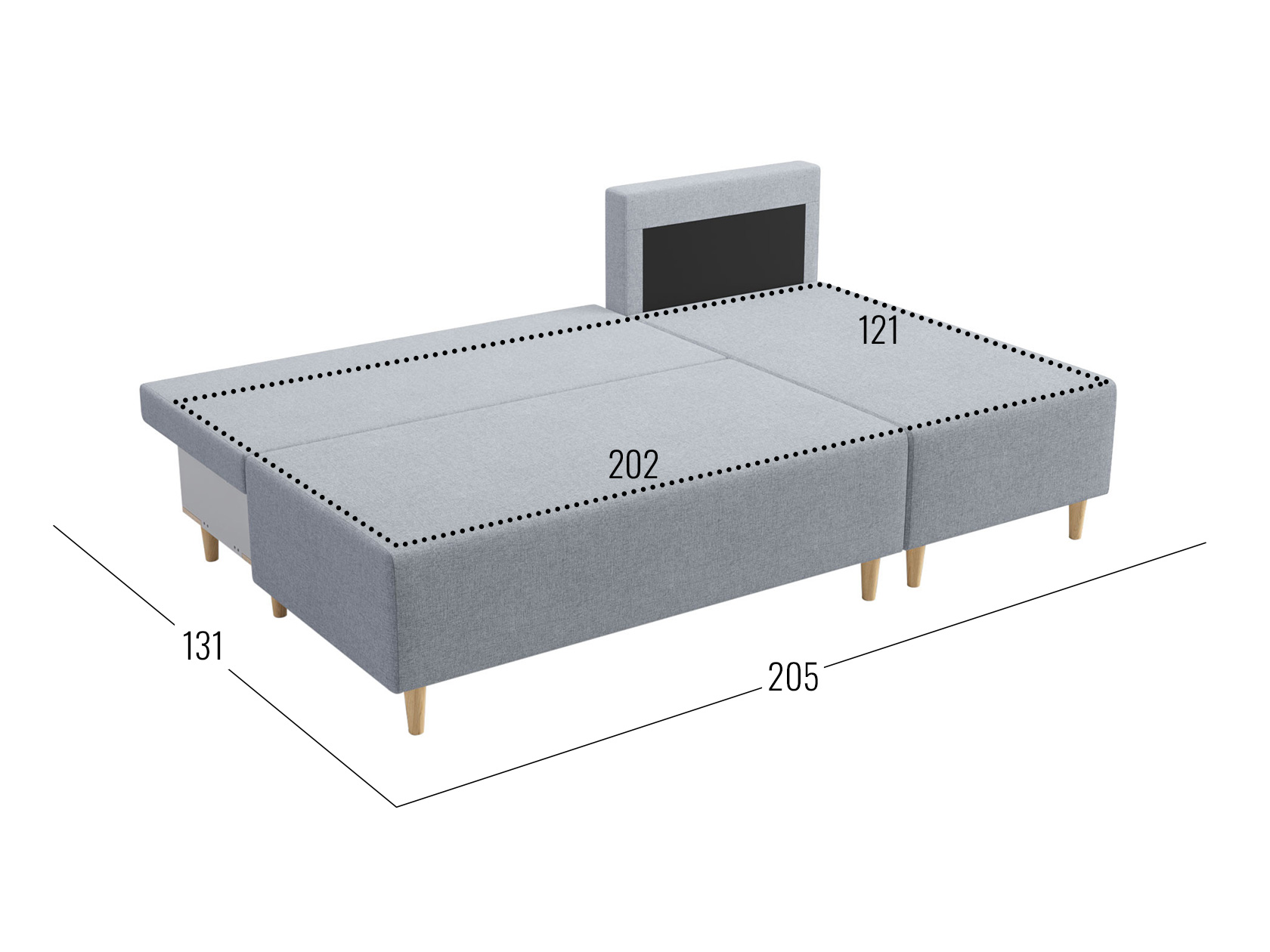 Посадочное место без подушек (ШхГ): 202 х 77 см.